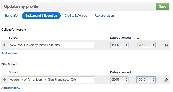 Here you can add any university or film school you attended. You can add additional items by clicking the Add another... link.